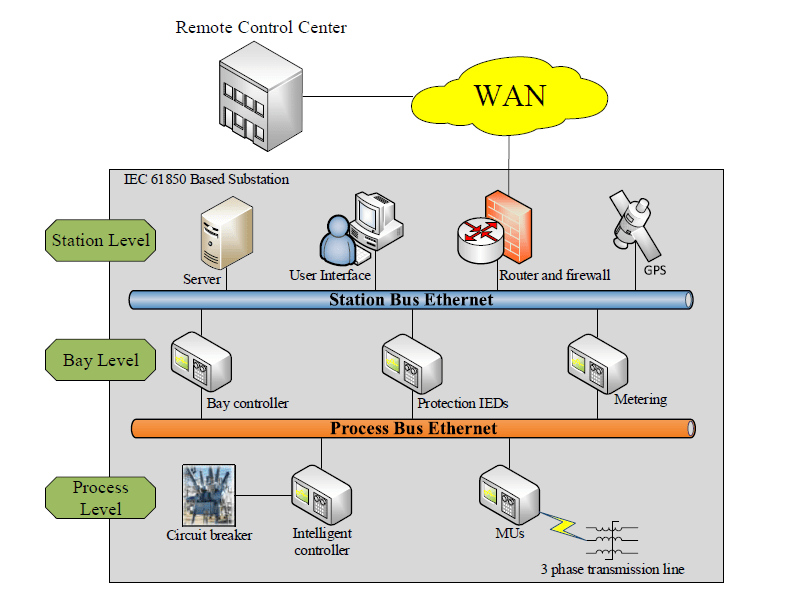 IEDs are connected to a local area network (LAN) in a substation via Ethernet-based communication. Hence, copper cables are replaced by communication lines (e.g., optical fibers and Ethernet cables) that offer higher transmission rates. All data and control commands can be transmitted using a single communication line, leading to a reduced cost.