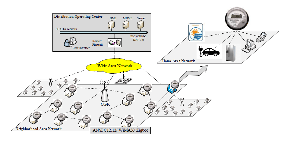 A smart meter also serves as a controller and a router in a home area network (HAN). Based on the vision of the Internet of Things (IoT), home appliances can be connected to the Internet and controlled by smart phones via the Internet. Smart meters are ideal devices as a controller because they support wireless communication [26]. In a wireless communication environment, appliances can be added/removed in a HAN without wiring and configuring issues. Currently, most smart meters are designed to use the ZigBee communication protocol defined in the IEEE 802.15.4 standard [27]. ZigBee has a communication distance limit because the technology is designed for electronic devices with low power consumption. Unlike Wi-Fi technology using a star topology, ZigBee support devices are connected in a meshed network where data can be exchanged between end-devices. Therefore, the transmission distance can be extended by hopping among devices in the same LAN. The communication structure of an AMI network is shown in Figure 3. A connected grid router (CGR) collects meter data in a neighborhood. Several communication links pass the data from end points to the CGR. Commands from a control center propagate in reserve direction from the CGR to the control target. If any of the meters in the middle of a linkage go off-line, the link topology will be automatically reconfigured by a preset plan. However, computer viruses or malicious application programs can also be spread in an AMI network in a short time, since meters can communicate with each other. Thus, many cyber security studies on AMI focus on the security of communication protocols and secured communication structures [28-30]. NIST and user groups, such as the Open Smart Grid, have produced reports and enacted requirements to ensure that manufacturers and policy makers incorporate cyber security from the beginning of the development process. These documents range from risk assessment [31,32] to security requirements [4].
