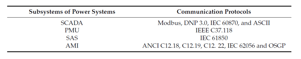 Communication protocols define the digital data formats and rules for telecommunication. With respect to different requirements (e.g., latency, security and packet size) of communication systems, different communication protocols are utilized. The latest version of the communication protocols in power systems is listed in Table 1. In addition, vulnerability assessment approaches of the subsystems (i.e., SCADA, PMU, SAS and AMI) of power grids are provided. The information of vulnerability studies has been tabulated in Table 2.