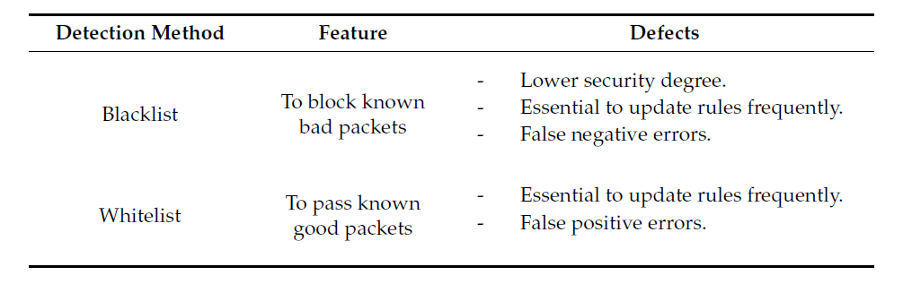 Blacklists and whitelists are two typical detection approaches. A comparison is shown in Table 3. Anti-virus applications for personal computers are good examples that use the blacklist. A virus can be recognized by comparing its signature with records in a database. If the signature is matched, the virus will be quarantined or deleted. In contrast, an example of the whitelist detection system is the access to a control system, which utilizes a database to record the information of authorized users. Database rules must be updated frequently for both whitelist and blacklist detection systems. Otherwise, the latest anomalies would not be recognized by the detection system. Similarly, the whitelist detection system needs to be updated so that it allows the newly-authenticated operations to be conducted.