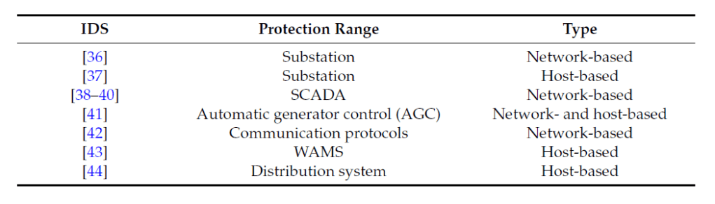 Intrusion detection technologies have been explored in the ICT environment. However, attack vectors, vulnerability, availability requirements and interactions between physical and cyber domains are new challenges to power systems. Several studies of IDSs for the power grid have been reported. A list of IDSs is shown in Table 4.