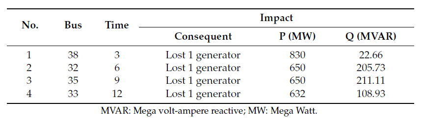 In the first scenario, the targets are selected as Substations 38, 32, 35 and 33. Note that the most valuable targets are the buses connected to generators directly. The attack starts at t = 3 s. One substation is compromised every 3 s. The last target (i.e., Substation 33) is compromised at t = 12 s. The attack sequence and the target information are listed in Table 5. During the attack, over-current relays report that circuit breakers are opened without sensing an over-current condition. In Figure 6, the targeted substations are depicted in the one-line diagram of the IEEE 39-bus system. After four generators connected to the targeted substations are disconnected, a cascading sequence of events is triggered, since the power system loses a significant portion of generation capability. A wide area outage occurs at the last stage. The load and generation levels of the IEEE 39-bus system are shown in Table 6. Generators cannot provide sufficient MW power to serve the load after the cyber attack. Dynamic simulation results of the cyber attack are shown in Figure 7.