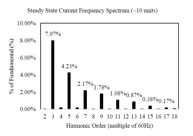 It should be noted that Fig. 7 only displays up to the 18th harmonic however harmonics were factored into calculations in this paper up to the order of 34. As can be observed in Fig. 7, the individual harmonics with the greatest magnitude are harmonics 3, 5, 7 and 9 with percentages of 7.97, 4.23, 2.17 and 1.78 percent respectively.