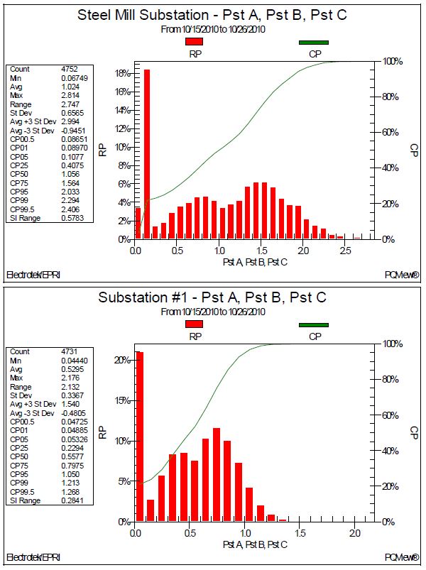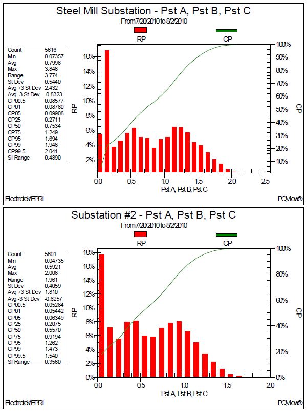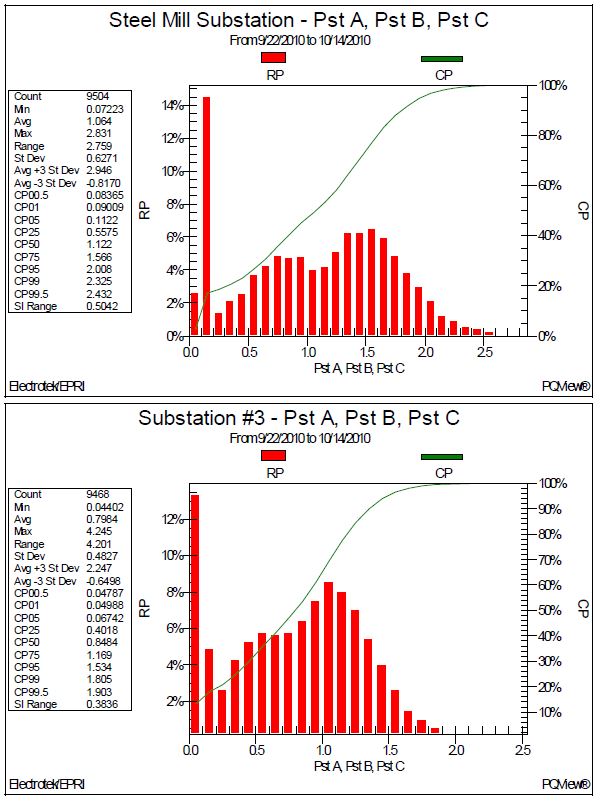 Figure 4 shows the three-phase voltage flicker Pst histograms measured at the 138kV Steel Mill Substation and at Substation #2. The results for the Steel Mill Substation included a CP50 of 0.75, a CP95 value of 1.69, and a CP99 value of 1.95. The results for Substation #2 included a CP50 of 0.56, a CP95 value of 1.26, and a CP99 value of 1.47.