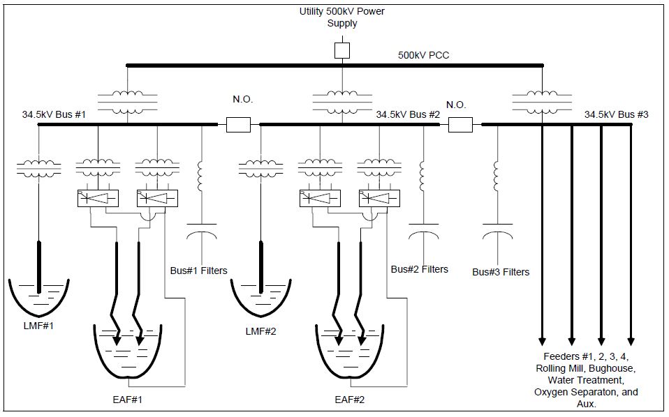 The steel plant will be supplied by a utility from its 500kV transmission system. The available short-circuit capacity from the utility will be 25,000A, 21,600 MVA; 19233A, 16,648 MVA; and 12,940A, 11,205 MVA respectively under different utility operation conditions. The steel plant’s electric power system will consist of a 500kV to 34.5kV substation. The substation 34.5kV bus is sectionalized. Sections 1 and 2 supply the melt shop, each has an 80 MW dual electrode dc arc furnace (EAF) and a 15 MW ac ladle furnace (LMF). Section 3 of the 34.5kV bus supplies a distribution system for the rolling mill. The auxiliary system of the steel plant will contain various types of air compressors, water pumps, ac drives and cycloconverters. A diagram of the overall facility represented for the study is provided in Figure 1. For simplicity, details of the system connection have not been shown. Multi-stage harmonic filters on each of the 34.5kV buses are indicated using a single filter symbol.