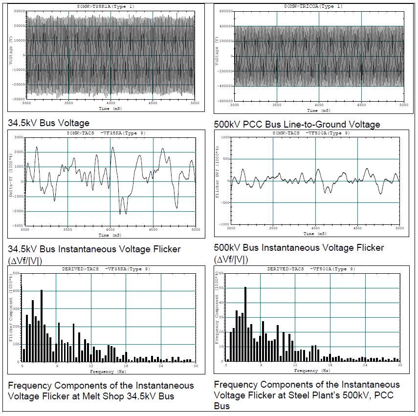Under weak source conditions and both furnaces operating simultaneously, the maximum instantaneous flicker level reached 0.6% at the 500kV PCC bus and reached 5% at the 34.5kV furnace supply buses inside the steel plant. The simulation shows that the frequency spectra of the instantaneous flicker range from 0.5 to 30 Hz, with a great concentration within the 2 to 10 Hz range. This level of flicker, especially with these frequency components in the most sensitive range, has the potential to cause problems. If the steel manufacturer plans to operate both furnaces simultaneously with this weak source condition, installation of an SVC is recommended.