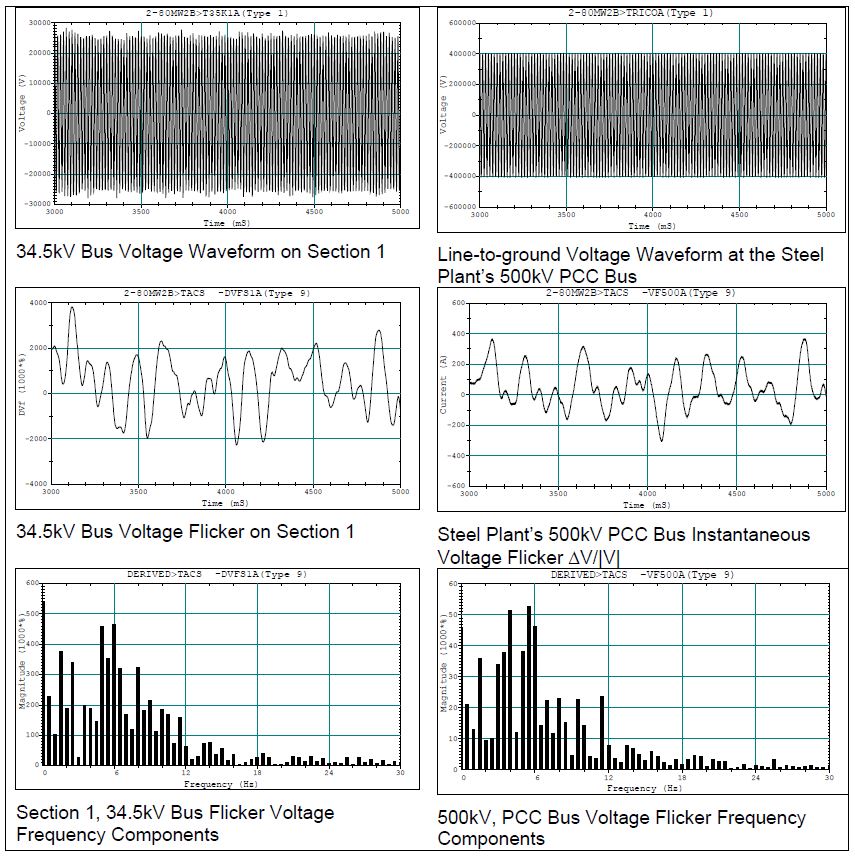 As expected, comparing the first and fourth case in the table shows that a 100Mvar capacitor at the melt shop 34.5kV bus has only a slight impact on the voltage flicker at 34.5kV and basically no impact on flicker at 500kV. The reason is that, compared with the utility supply source, the current loop impedance of the compensation circuit is fairly high, especially at flicker frequencies. As a result, even with the local var supply, the major portion of the fluctuation in reactive power is delivered from the utility system. The capacitor compensation is mainly for melt shop power factor correction.