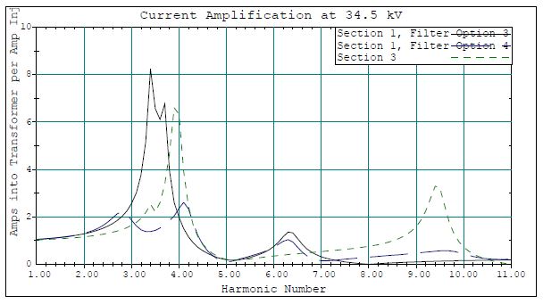 Comparing the response for options 3 and 4 shows that the additional branches and damping in option 4 provide significant reduction of the current magnification between the third and fourth harmonics. However, the performance actually at the third and fourth harmonics is very similar (actually better at the fourth harmonic for option 3). The interharmonics between the third and the fourth are much lower than the maximum values most of the time and the maximum magnification is less than 10 for the proposed design. The damping provided by the recommended design (option 3) is sufficient to prevent problems at the interharmonic frequencies.