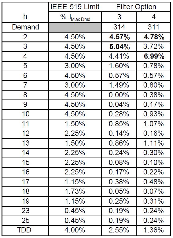 The following table shows a compares the expected harmonic current levels at the PCC with the IEEE Std. 519 limits for both filter options 3 and 4. Note that all harmonic currents are expressed in percent of a calculated demand current (first row of the table). This estimated demand current includes the effect of the filter-provided reactive compensation.