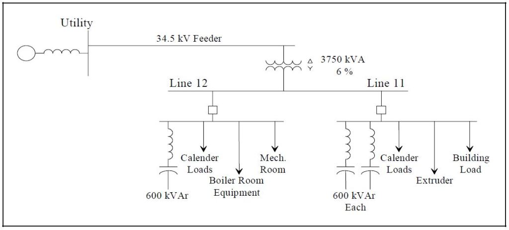 The plant electrical system consists of two sets of 480 volt switchgear fed from a common 480 volt bus. A 3750 kVA transformer steps down from a 34.5 kV distribution line for the entire facility. Figure 2 shows a oneline diagram of the facility.