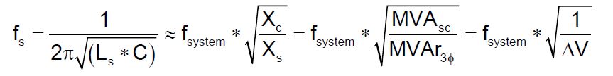 Energizing a shunt capacitor bank from a predominantly inductive source creates an oscillatory transient that can approach twice the normal system peak voltage (Vpk). The characteristic frequency (fs) of this transient is given by:
