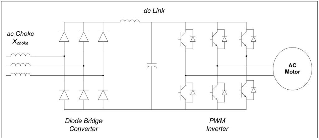 In addition to the voltage swell and voltage sag event on the distribution feeder primary, a customer transformer was modeled so the voltage on the 480-volt bus could be determined. A typical 10 hp adjustable-speed drive was included in the simulation model to determine the potential for nuisance tripping of the drive due to an undervoltage on the drive’s dc link. The oneline for the drive model is shown in Figure 3.