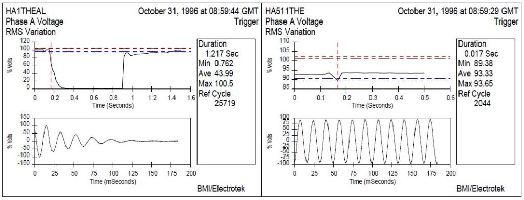 On January 28, 1997, the network feeding the Manhattan location experienced a voltage sag where the voltage dropped 52% below the nominal 125 volts rms for 11 cycles (0.183 seconds) to 48.4%. Under normal conditions this event was severe enough to cause unprotected office and computer equipment to drop off-line, causing loss of data. Figure 3 illustrates the input and output voltages of the RMG during the voltage sag.