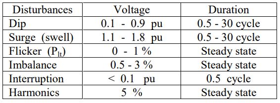 The IEEE 519-1992, IEEE 1159-1995 describe the compatibility level required by equipment connected to the network, as well as the limits of emissions from the devices, table (1) summarized the definition of disturbances. If these limits values are exceeded, the polluter may be requested to provide for corrective action.