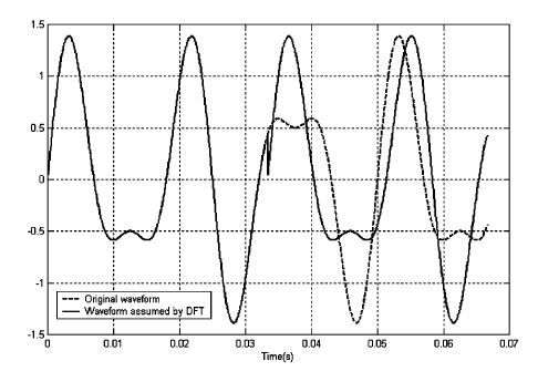 There are cases, however, where the interharmonic components are produced by the picket-fence effect of the DFT, due to sampling the signal spectral leakage. For instance, if the frequency of the noninteger harmonic component is changed to 100 Hz in last example and the selected rectangular window size is still 33.4 ms, the window will contain 3.33 cycles of the 100 Hz component. Since DFT assumes the windowed waveform will repeat itself outside the window, the repetition of the 100 Hz component is therefore incomplete. The waveform “seen” by the DFT is different from the actual waveform, as shown in Fig. 2. This leads to the creation of a main interharmonic component at 90 Hz with a low amplitude but similar to that of the genuine interharmonic at 100 Hz, and further additional spectral components as evidenced in Fig. 1(b) being not genuine due to the spectral leakage effect. Of course, the entity of these nongenuine interharmonic components strictly depends on the spectral characteristics of the window adopted (for instance, Hanning) to weight the signals and, thus, an opportune choice can reduce the spectral leakage effects (see Section III for more details).