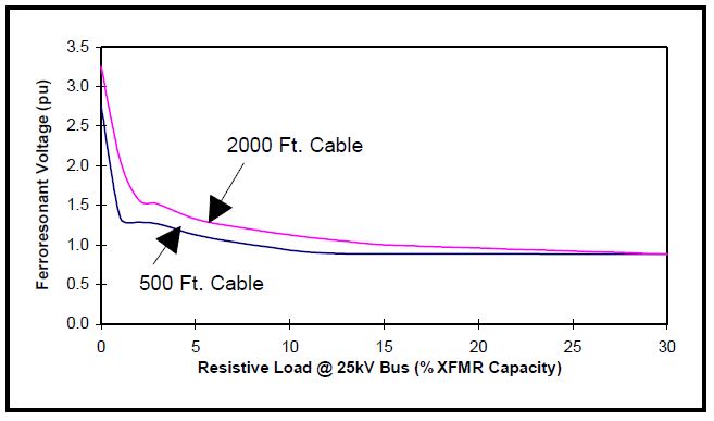 Figure 4 shows the effect of resistor load on ferroresonance. We took two lengths of cable, 500 ft and 2000 ft, for which the 2500-kVA transformer exhibited significant ferroresonance at no load and plotted the peak voltage appearing on the cable for a range of balanced resistive loads on the transformer. As can be seen, the overvoltage drops quickly with the addition of only 1 or 2% load. Technically, the transformer is still “in ferroresonance” up to about 5% load and the voltage magnitudes are near normal, or less than normal, at 15% load. This is in almost complete agreement with what has been reported in the literature.