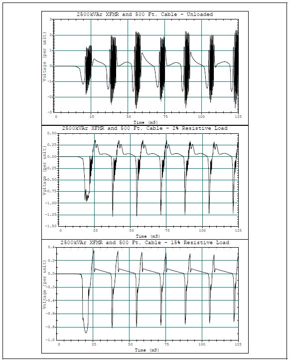 Industry analysts have historically assumed that when this voltage exceeds 125%, the system is said to be “in ferroresonance”. Of course, there is similar activity even when lower voltages appear. At 100 ft of cable, all the transformer sizes meet this criterion when there is no load. The 2500 kVA transformer just meets this criterion at 100 ft and is definitely in ferroresonance by 200 ft. The smaller transformers require proportionately less cable. The 150 kVA transformer is somewhat of an anomaly, indicating the fickleness of ferroresonance.