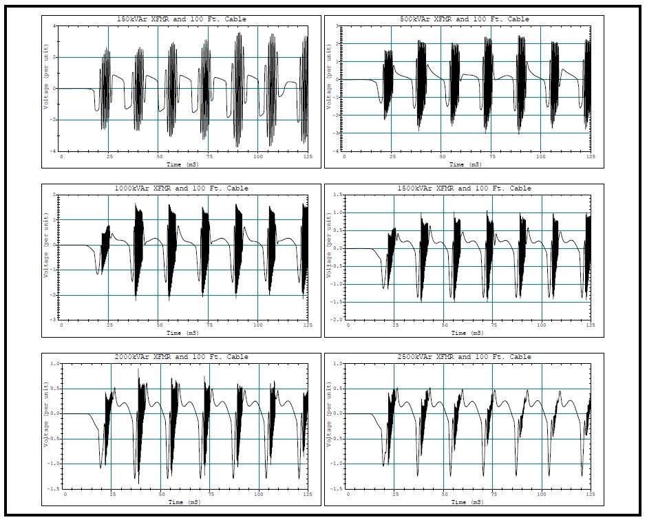 Figure 6 and Figure 7 show other representative waveforms illustrating the variation of waveforms with transformer size and cable length, respectively.