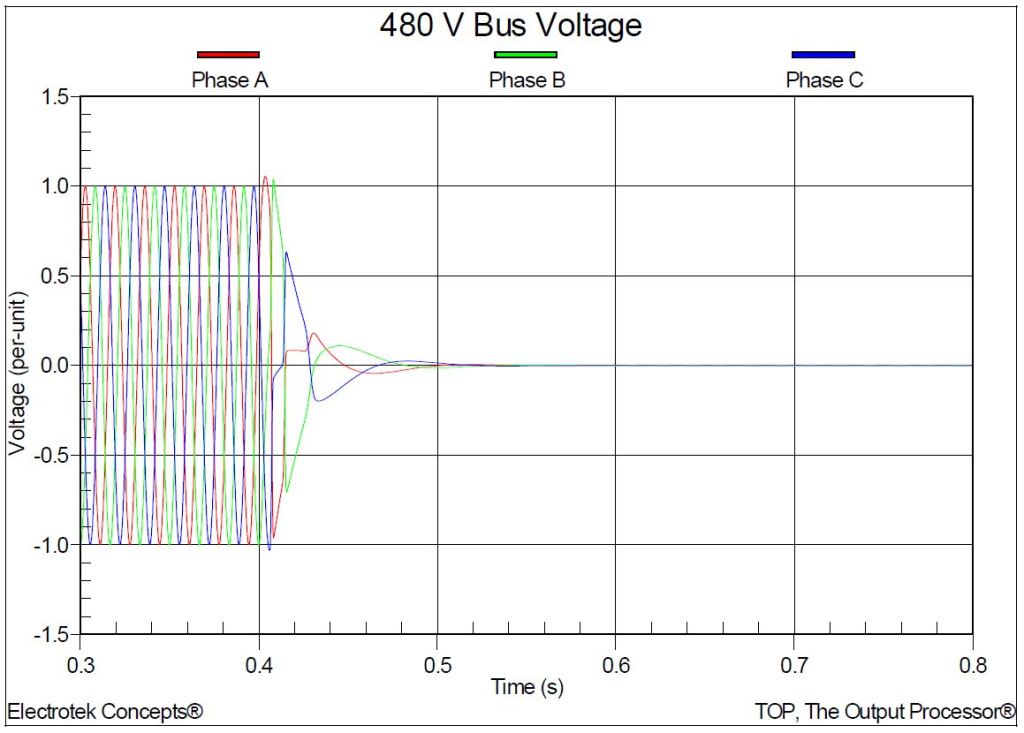 The final case investigates the use of a three-phase recloser rather than three single-phase fuses. Figure 4 shows the three-phase voltage waveform at the secondary winding of one of the 500 kVA transformers with both of the 500 kVA transformers unloaded and with a three-phase switch opening on the primary distribution feeder (Case 2c). No ferroresonance occurs during the three-phase switching.