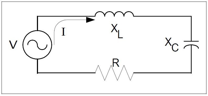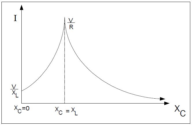 Let us vary XC and hold R and XL at a constant value. When XC = 0, the current flowing in the circuit is I=V/ XL, and when XC is very large, the current becomes negligible. In between these two extremes, |XC|=|XL|. The current becomes very large limited only by R, i.e., I=V/ R. The large current can produce considerable overvoltage. Figure 2 illustrates the magnitude of current under various XC values. The possibility of XC exactly matching XL is remote since both values are linear or constant. However, if the value of XL varies, such as in an iron core transformer, the possibility of XC equaling XL increases considerably.