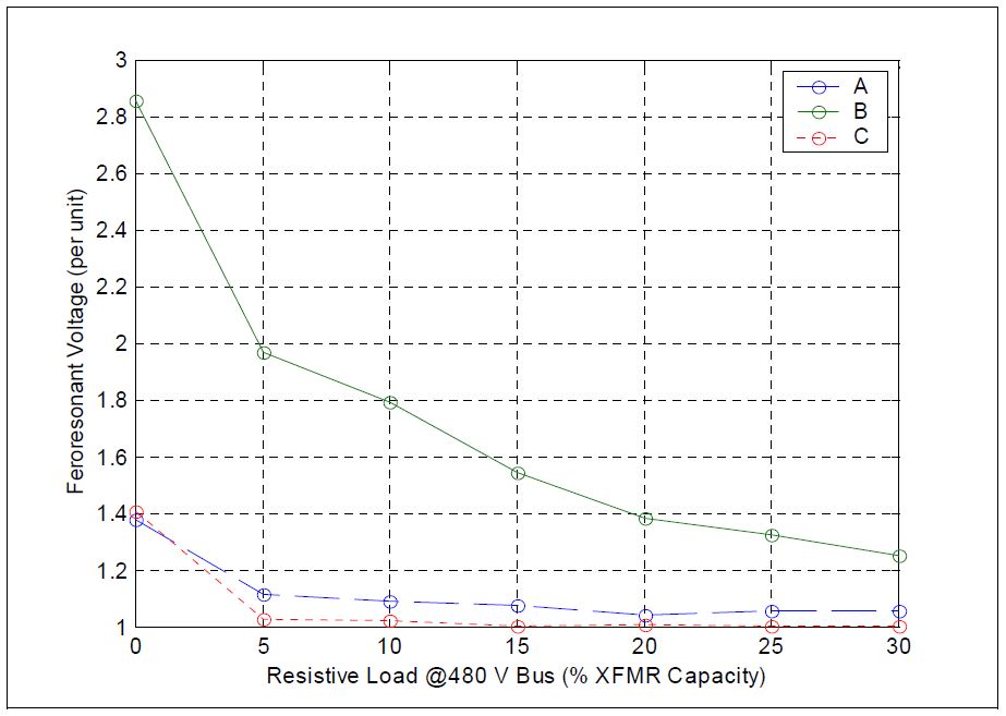 Figure 11 shows the summary of peak overvoltages when both transformers are loaded from 0% to 30% of their capacities. The overvoltage on phase B drops quickly as both transformers become more loaded. From the analysis presented in this section, it can be concluded that both transformers should be loaded with a minimum of 100 kW resistive load or loads equivalent to 20% of transformer capacity to avoid the ferroresonance condition. The rapid drop in ferroresonant voltage magnitude is due in large part to the introduction of the resistive load.