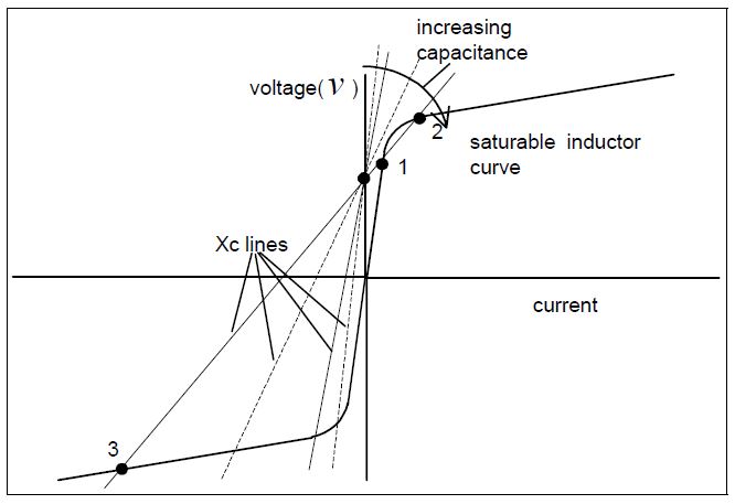 It is obvious that there may be as many as three intersections of the capacitive reactance line with the inductive reactance curve. Intersection 2 is an unstable operating point and the solution will not remain there in steady-state. However, it may pass through this point during a transient. Intersections 1 and 3 are stable and will exist in steady-state. Obviously, if the values become an intersection 3 solution, there will be both high voltages and high currents. For small capacitances, the XC line is very steep, usually resulting in only one intersection in the third quadrant. The capacitive reactance is larger than the inductive reactance, resulting in a leading current and higher than normal voltages across the capacitor. The voltage across the capacitor is the length of the line from the system voltage intersection to the intersection with the inductor curve. As the capacitance increases, there can be multiple intersections as shown. The natural tendency then is to achieve a solution at intersection 1, which is an inductive solution with lagging current and little voltage across the capacitor. Note that the voltage across the capacitor will be the line-to-ground voltage on the cable in a typical power system ferroresonance case.