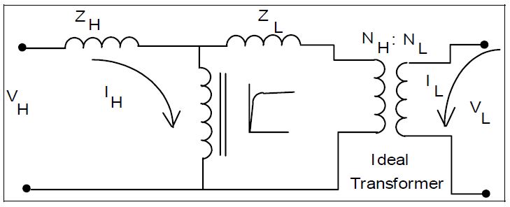 For single-phase transformers, three-phase shell form transformers, and three-phase triplexed transformers (three single-phase units stacked in one can), the conventional T model will suffice because there is no coupling between the magnetic circuits. Figure 5 shows the T model for a two winding transformer, which will suffice for standard switching surge and ferroresonance studies. For higher frequencies, it would be necessary to model the capacitances and inner winding construction.