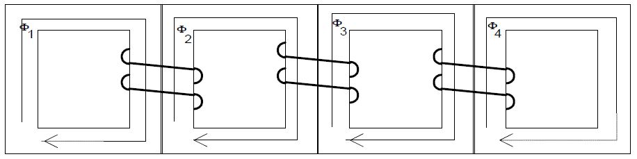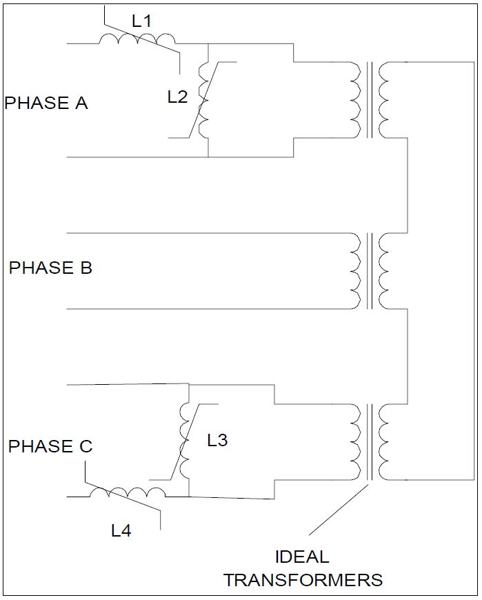 The five-legged core transformer design [3] is illustrated in Figure 6. The design typically consists of four individual cores tied together to create the five-legged core transformer. The inner three legs carry the phase windings with flux paths as indicated. The equivalent circuit can be derived from the flux path direction and is shown in Figure 7.