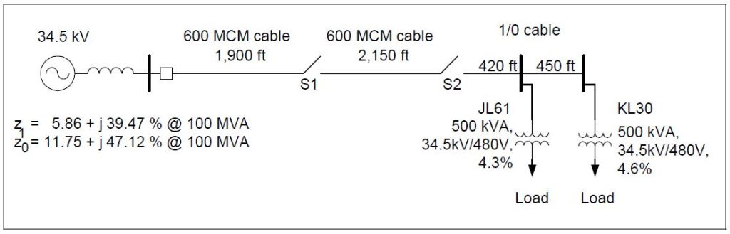 The lengths of the underground cable from the second switch (S2) to the first transformer (JL61), and from the first transformer (JL61) to the second transformer (KL30) were 420 and 450 feet long, respectively. The type of the cable was 1/0 with the following characteristics: