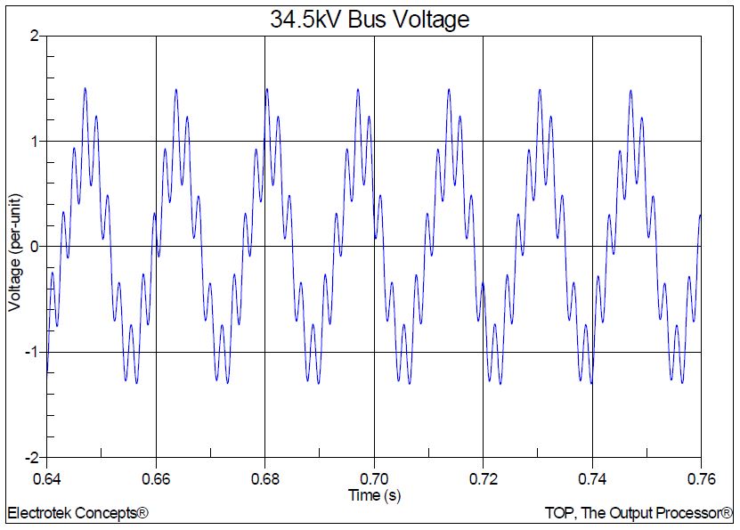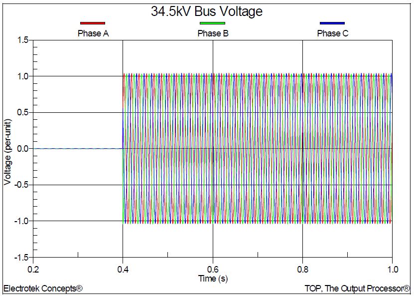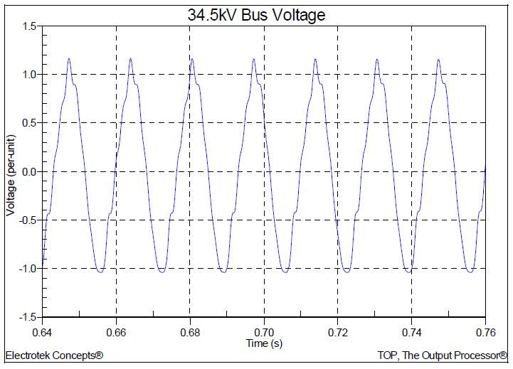 Figure 5 shows the worst-case simulated primary transformer current (Phase A) during energization of the unloaded transformer with the 3.6 MVAr capacitor bank in-service on the 34.5kV bus. Figure 6 shows the corresponding worst-case secondary 34.5kV bus voltage (Phase C).