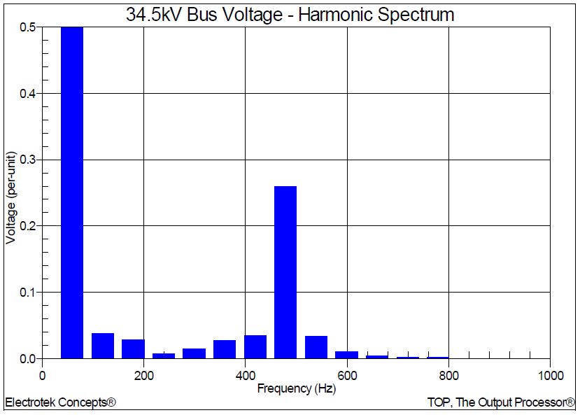 As can be observed from the simulation results, the current waveform is much more distorted than the initial case that did not have the 3.6 MVAr capacitor bank in-service. In addition, the voltage waveform shows a resonance condition and the resulting dynamic overvoltage. Dynamic overvoltages are defined as long-term resonant overvoltages lasting many cycles that can cause damage to capacitor units and other adjacent equipment, such as transformers and surge arresters. Figure 7 shows the results of a Fourier analysis of the voltage waveform. The highest harmonic voltage component is at 480 Hz, which corresponds to the previous resonance calculation.