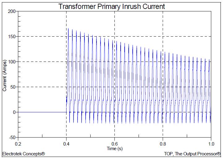 Transformer inrush current is rich in 2nd, 3rd, 4th, and 5th harmonics. The exact characteristics of the inrush current are dependent on transformer parameters (e.g., saturation curve) and the initial condition of the residual transformer flux.