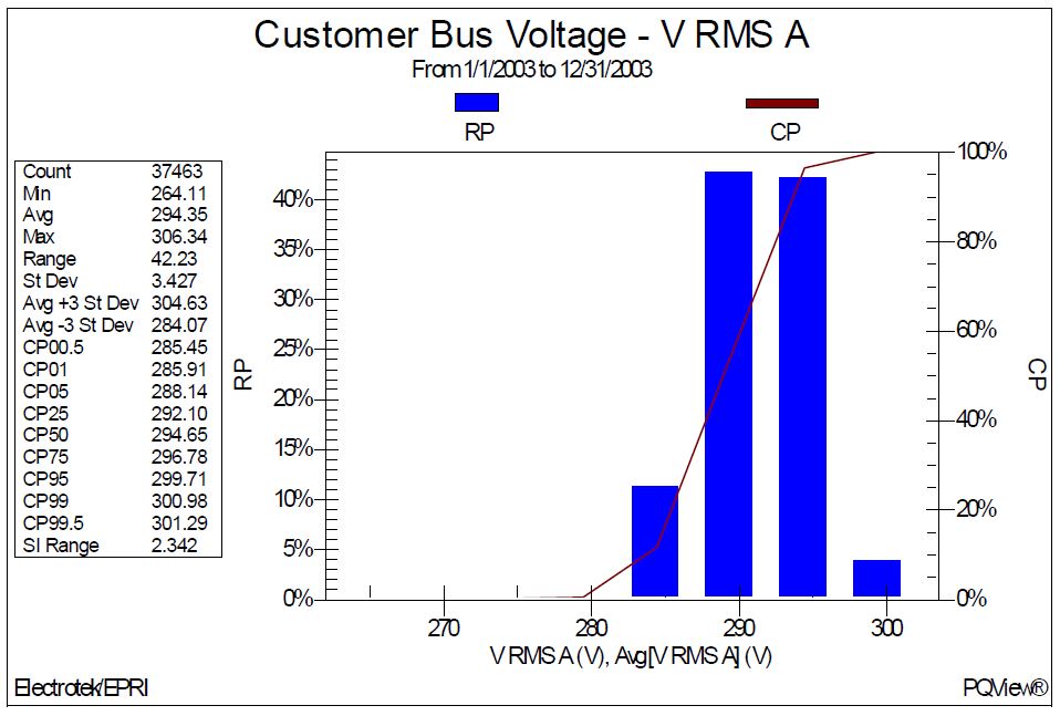 Figure 2 shows the rms voltage histogram for the twelve-month monitoring period. Statistical analysis of the 37,463 individual steady-state measurements yielded a minimum voltage of 264.1 V, an average voltage of 294.4 V, and a maximum voltage of 306.3 V. In addition, the CP95 value was 299.7 V (108% of nominal). CP95 refers to the cumulative probability, 95th percentile of a value.