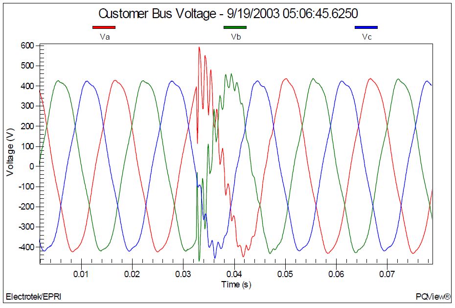 Another relatively common transient event was during a fuse operation on one of the utility distribution feeders. A representative three-phase waveform is shown in Figure 8. The peak magnitude of the measured transient voltage was 593.8 V (1.52 per-unit) and the principal frequency for the transient waveform was approximately 300 Hz.