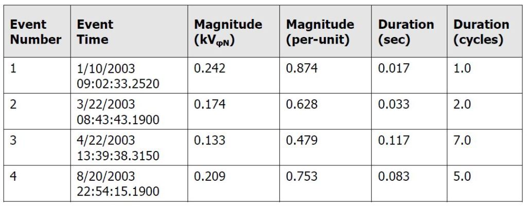 Voltage sags and momentary interruptions are inevitable on the electric power system. Many of these variations occur during faults on the power system, and since it is impossible to eliminate the occurrence of faults, there will always be voltage variations on customer systems. Other sources of voltage variations include unbalance, induction motor starting, and voltage flicker. Table 1 shows an rms variation event summary listing for several of the sixty rms variation events that occurred during the twelve-month monitoring period. The table shows the date-and-time for each event, as well as the phase-to-neutral voltage magnitude in both volts (kV) and per-unit and the event duration in both seconds and cycles.