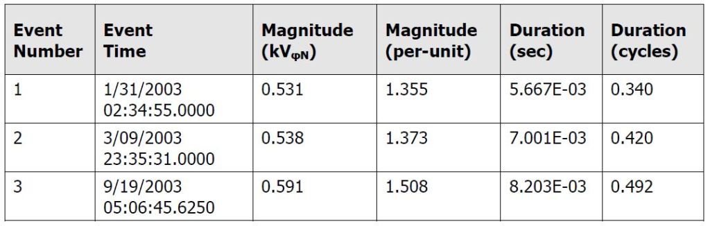 Table 3 shows a transient event summary listing for several of the representative transients that were measured during the twelve-month monitoring period. There were several thousand oscillatory transients that were captured. The table shows the date-and-time for each event, as well as the peak phase-to-neutral voltage magnitude in both volts (kVpk) and per-unit and the event duration in both seconds and cycles.