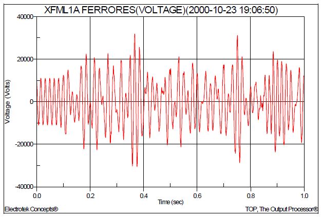 Figure 11 shows a phase-to-phase feeder voltage during a ferroresonance event that was caused by an unbalanced switching operation. The peak voltage was approximately 1.42 per-unit. The instantaneous voltage measurement was captured using a Dranetz-BMI 8010 PQNode and stored using the IEEE COMTRADE file format. The power conditioning options for this event include three-phase switches and secondary loads. The keywords for the waveform include ferroresonance and overvoltage, while the slang term that should be avoided is surge.