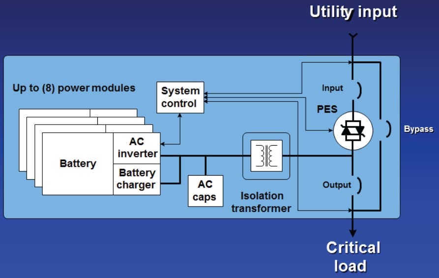 When the utility source voltage returns to its normal limits, the UPS synchronizes the output voltage with that of the utility source, and sends a “close” signal to the PES along with a “stop” signal to the inverter module(s). After a few seconds, the battery chargers turn on to restore the batteries to 100% capacity [15].
