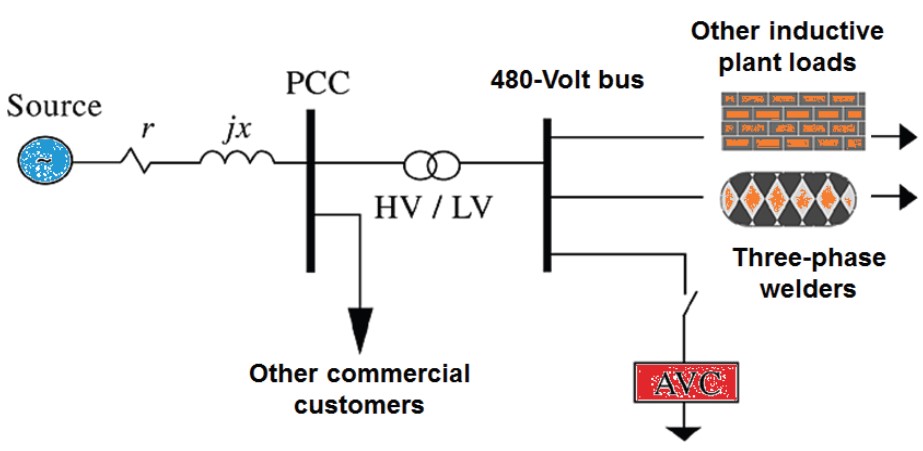 Fig.13 shows the single-line diagram of the AVC/SVC system. Normally, the AVC systems are installed in parallel with the dynamic load, which continuously monitors line-to-neutral voltage and current on each phase of the feeder serving the load. By measuring the inductive component of the current, the microprocessor-based controller of the AVC determines the needed capacitive compensation. The required reactive power is then injected into the system by closing the appropriate power electronic switches. By using an array of sophisticated algorithms, a response time close to 1⁄2 cycle can be achieved. Notably, the capacitors are always pre-charged and ready until the triggering signal is applied to the switches [16].