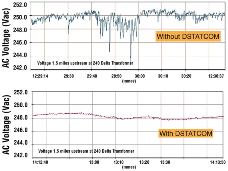 For the distribution system application, the STATCOM is controlled to inject or absorb reactive power to the grid, in order to support the dynamic load variations. From Fig.14, it can be observed that the currents supplied by the grid is pure sinusoidal waveform. Hence, the DSTATCOMs are widely utilized for dynamic compensation of the fluctuating loads, such as arc furnaces or other flicker producing loads. Fig.15 shows the typical experimental waveforms recorded in the field. It shows that the flicker effect in the dynamic load causes fluctuating grid voltages without compensation. However, when the DSTATCOM is used for compensation, the fluctuation in grid voltage is eliminated.