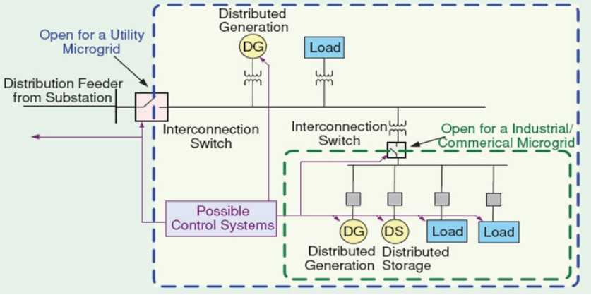 Fig.22 shows the circuit diagram of the micro-grid, which is similar to the configuration of the smart city. Notably, the distributed generation (DG) systems are indicated and their circuit diagrams are denoted, which include the solar energy, wind power generation, etc. The micro-grid can work in the grid-connection manner or islanding mode. In case of grid fault or abnormal conditions, the micro-grid works in the islanding mode thus the DG supplies the electricity to the load from the same feeder. In case of grid connected mode, bidirectional energy flow is achieved hence the abundant energy generated by the DGs can flow into the grid.