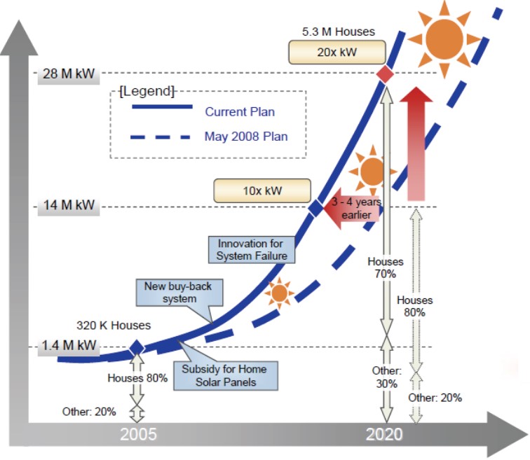 The photovoltaic (PV) system is appreciated for its ease of fabrication and declining cost in recent decades, which is most of the major driving forces for renewable energy. A lot of industrialized countries have put forward ambitious plan for developing solar energy as alternative for the fossil power generators, such as the US and Japan. Fig.23 shows the demonstration of Japan’s solar energy roadmap toward the year 2020. It shows that the total capacity of solar energy was only 1.4M kW in 2005, and a ten times increase of capacity is targeted in 2015 and the capacity would reach up to 28 M kW in 2020 based on the current plan. It is suggested that 5.3 million houses would install the solar panels in 2020 [41-45].
