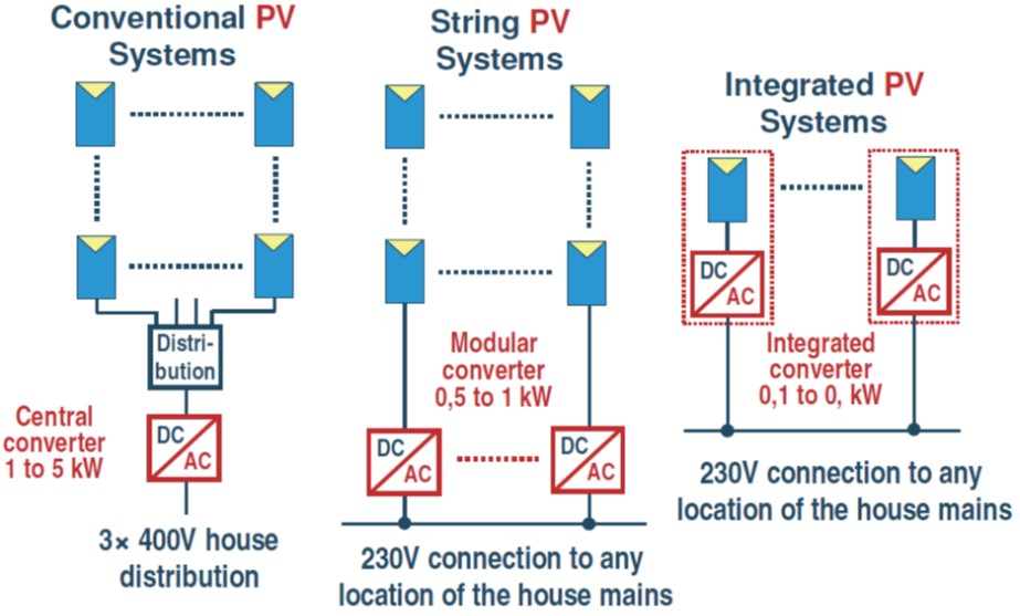 Fig.25 shows the configuration of the PV panels with the electric distribution network. Generally, there are three types of circuit topologies, as illustrated in Fig.25. The first one is the conventional PV system based on the central converter ranging from 1~5 kW power rating. And the PV panels are connected in series to synthesize the output dc voltage, and the dc/ac inverter is adopted to connect the PV systems with the network. The string PV systems are based on the modular converter ranging from 0.5~1 kW to connect a string of PV panels to the network. Another type of PV system is named the integrated PV systems, which is based on the individual dc/ac converter integrated with each PV panel, which provides flexible solution and higher reliability with tradeoff of the increased cost.