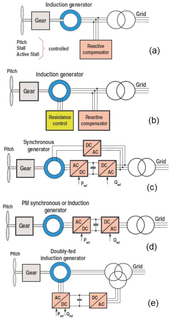 Fig.26 shows the circuit diagrams of the wind generation systems, which can be classified as the induction generator type and the synchronous generator type. Fig.26(a) shows the induction generator with reactive compensation. The gear box is controlled to regulate the active power output. Fig.26(b) shows the scheme of induction generator with both reactive compensation and the resistance control. Fig.26(c) shows the scheme of the synchronous generator based wind generation system by using ac/dc and dc/ac inverter structures. Fig.26(d) shows the circuit diagram of the induction or permanent magnetic (PM) synchronous generator. Fig.26(e) shows the circuit diagram of the wind generation system using double-fed induction generator.