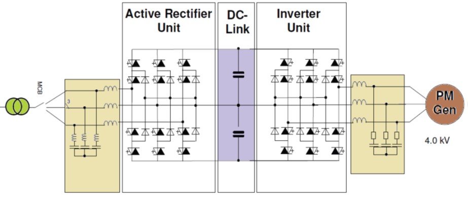 Fig.28 shows the circuit diagram of the medium voltage (MV) wind generator suing tri-level inverter and permanent magnetic (PM) generator. The tri-level inverter topology is widely used in medium voltage high power applications. The power rating of the wind turbine is normally 3~5 MW and the tri-level inverter has the minimum components requirement for the power electronic switches hence result in high reliability. Moreover, the IGCTs are normally used to meet the requirement of high current and efficiency