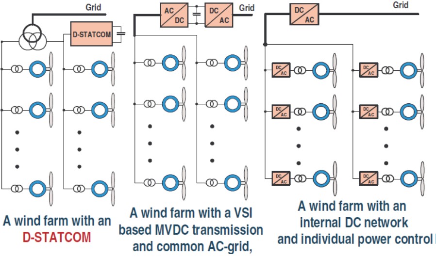 Fig.29 shows the circuit configuration of the wind power generators with the electric distribution network. In the first case, the wind farm is integrated with a shunt DSTATCOM for dynamic reactive power compensation. In the second case, the wind farm is made of multiple wind generators with a common ac grid, followed by the ac/dc and dc/ac converters to connect the wind farm to the grid. The third case denotes that the output of the individual wind power generator is connected to the grid through modular ac/dc converter, and a large capacity dc/ac converter is applied to convert the dc-link voltage into ac voltage [51, 52].