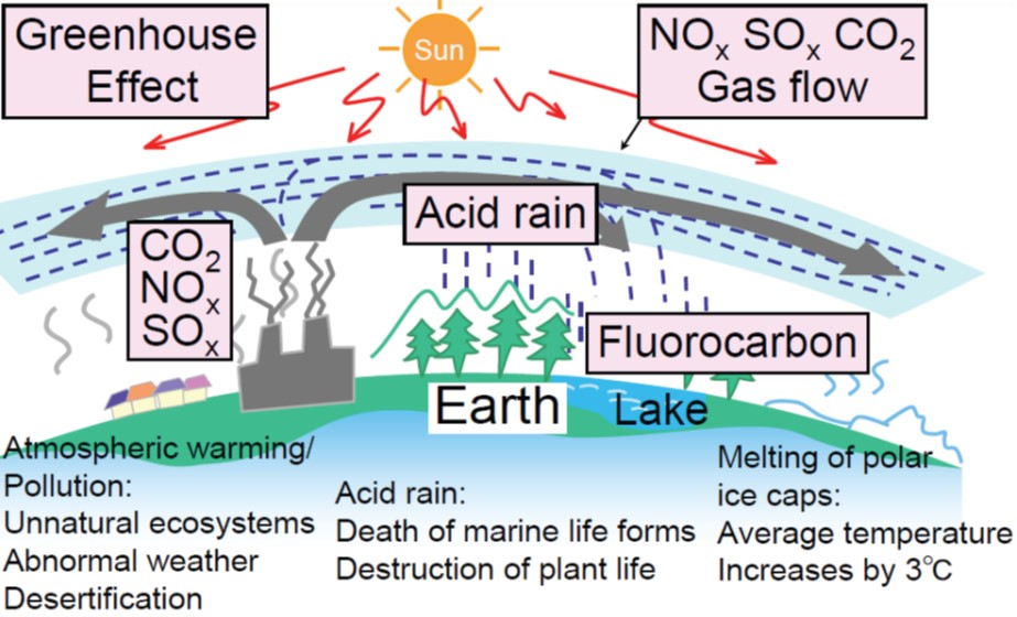 The ever-increasing global energy consumption causes severe damage to the environment. As the major producer of electricity, the fossil power plants produce almost one third of the carbon and sulfur pollution. Fig.3 shows a vivid illustration of the various pollution, which causes the global warming, acid rain and the melting of the polar ice caps. As a result, abnormal weather condition, unnatural ecology systems and desertification would be the unavoidable consequences. Hence, the new energy resources, such as the wind power generation, solar generation are excellent alternatives for the existing fossil power plants.