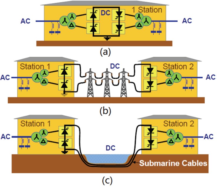 Fig.30 shows the illustration of the HVDC transmission system. Fig.30(a) shows the scheme of the back to back connection, which is utilized for frequency changing, or synchronous connection. Fig.30(b) shows the scheme of the point-to-point overhead line for bulk transmission and overland construction. Fig.30(c) shows the scheme of the point-to-point submarine cable transmission for bulk power transmission [54, 55].