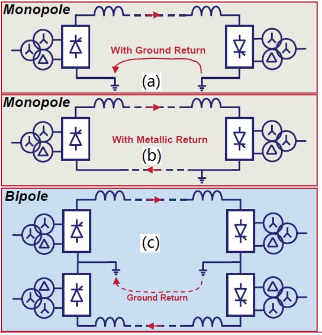 Fig.31 shows the circuit diagram of monopolar/bipolar HVDC systems. For very long distances and in particular for very long sea cable transmissions, a return path with ground/sea electrodes will be the most feasible solution, as shown in Fig.31(a). In many cases, existing infrastructure or environmental constraints prevent the use of electrodes. In such cases, a metallic return path is used in spite of the increased cost and power losses, as depicted in Fig.31(b).