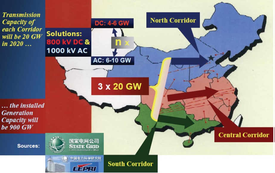 Fig.32 depicts the perspectives of the grid development in China using the AC and DC bulk power transmission from the western regions to the eastern economy centers. The focus is on the inter-connection of 7 large provincial grids of the northern, central and southern systems via three bulk corridors which built up a redundant ‘backbone’ for the whole grid. The north corridor is aimed to send bulk power from the fossil power plants in the inner-Mongolia and northern provinces to the capital. The central corridor is aimed to send bulk power from the three George’s hydro power plant to Shanghai. The south corridor is aimed to send the bulk power from the southwestern provinces to Guangdong and Hong Kong. Each corridor is planned for a sum of a bout 20 GW transmission capacity which shall be realized with both AC and DC transmission line with ratings of 4~10 GW each (at +/-800kV DC and 1000 kV AC). With these ideas, China investigated a total amount 900 GW installed generation capacity by 2020. The benefits of such a large hybrid power system interconnection are: